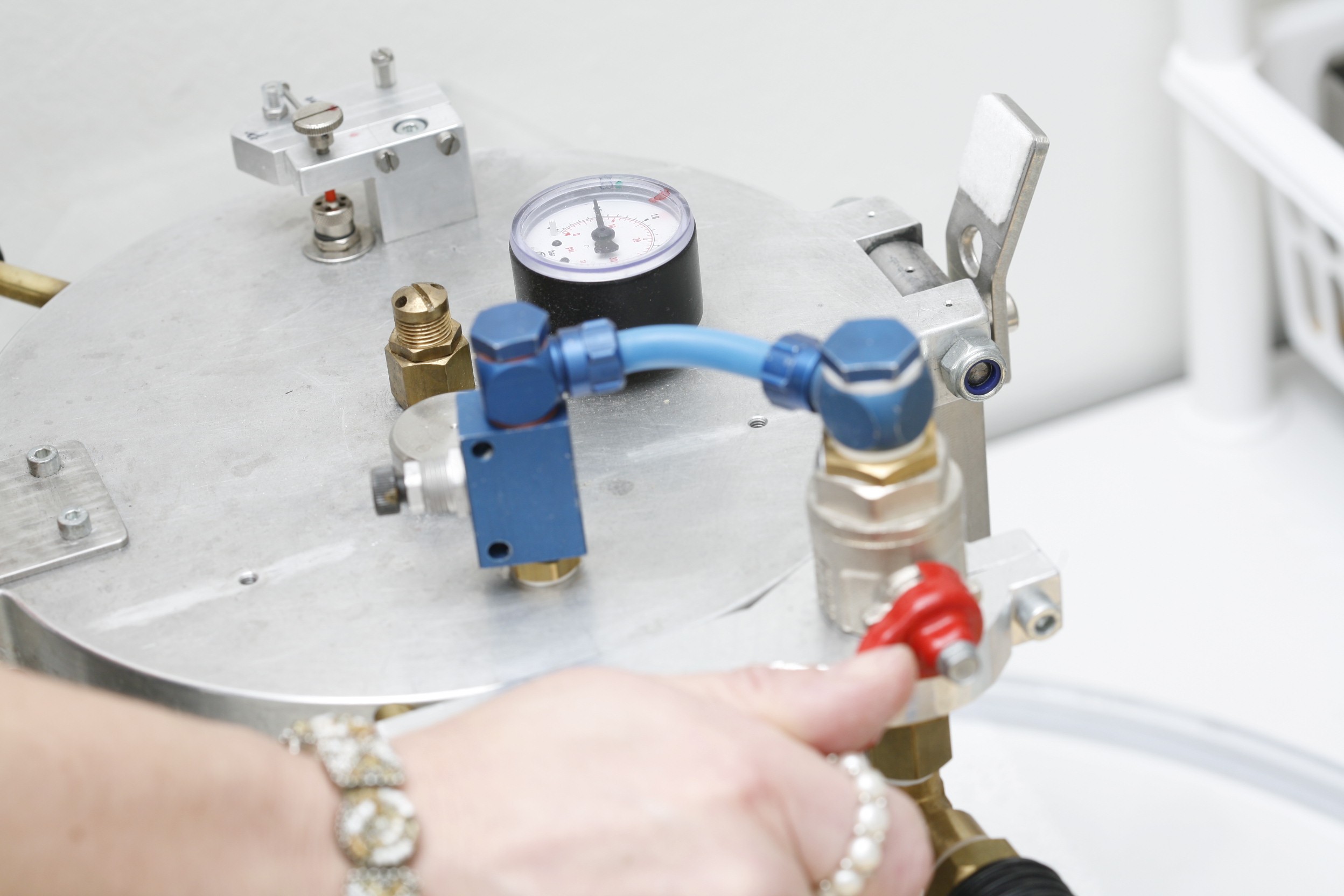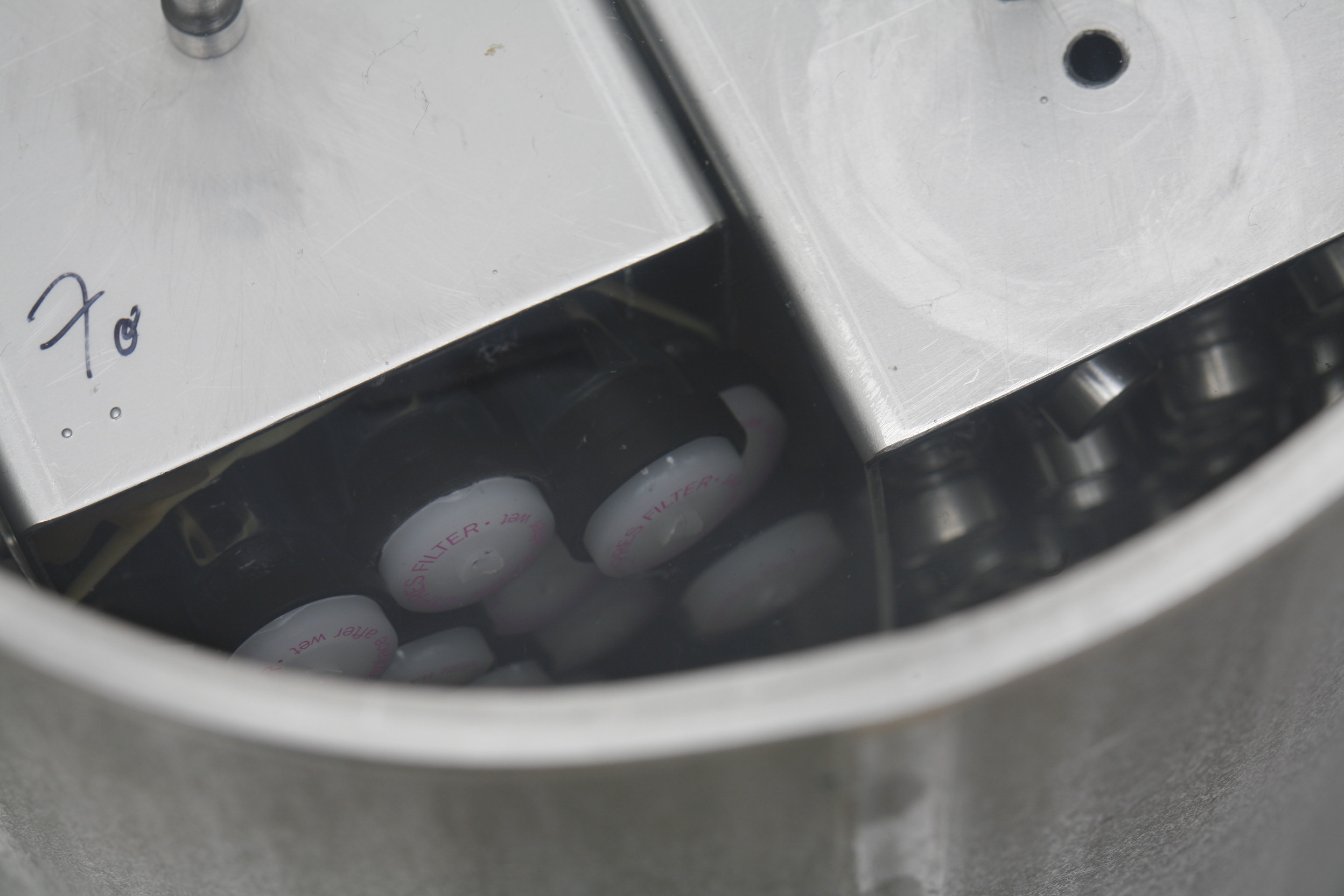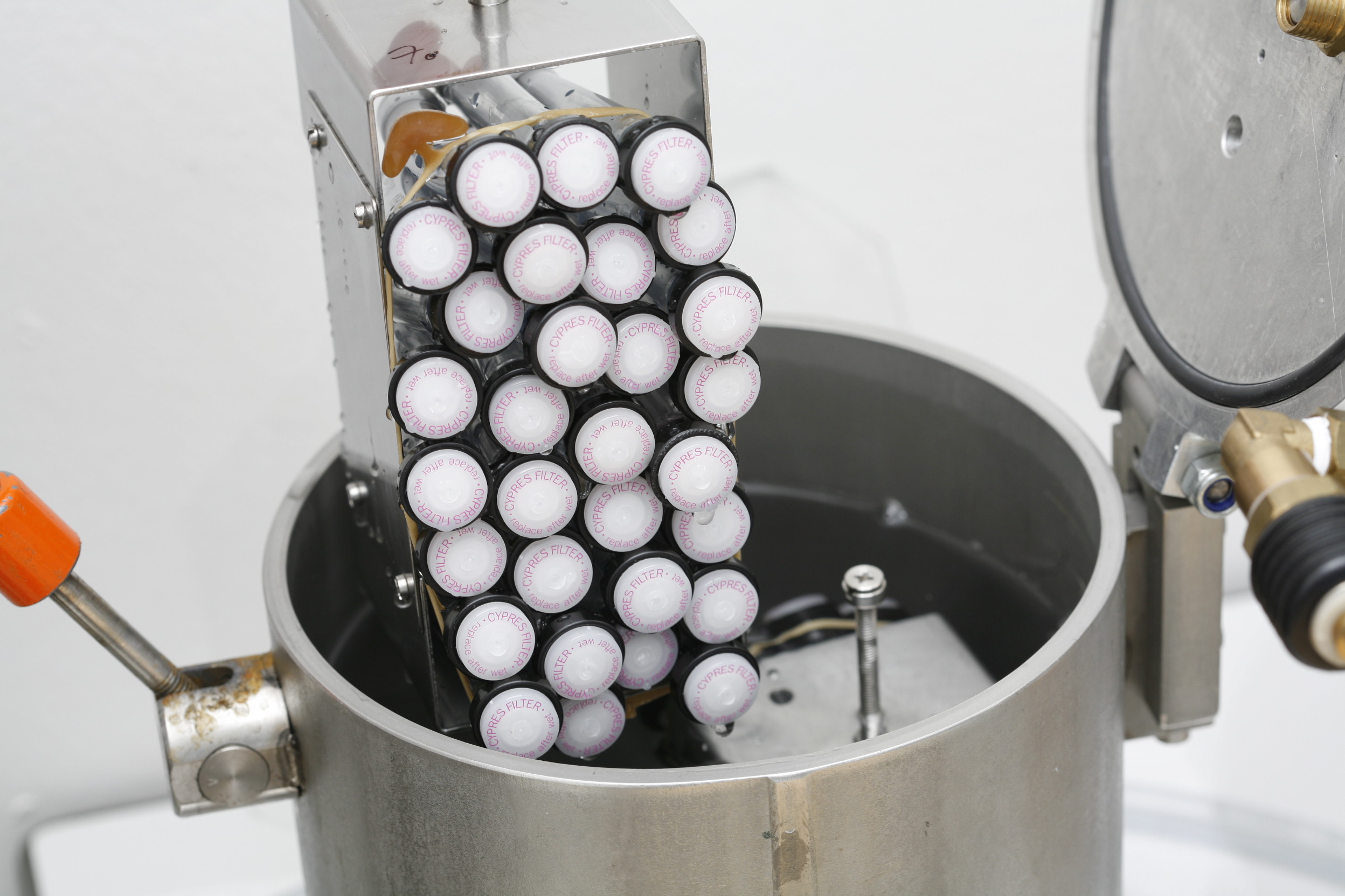Within the pressure barrel the filters are tested with higher water pressure using clean, distilled water.