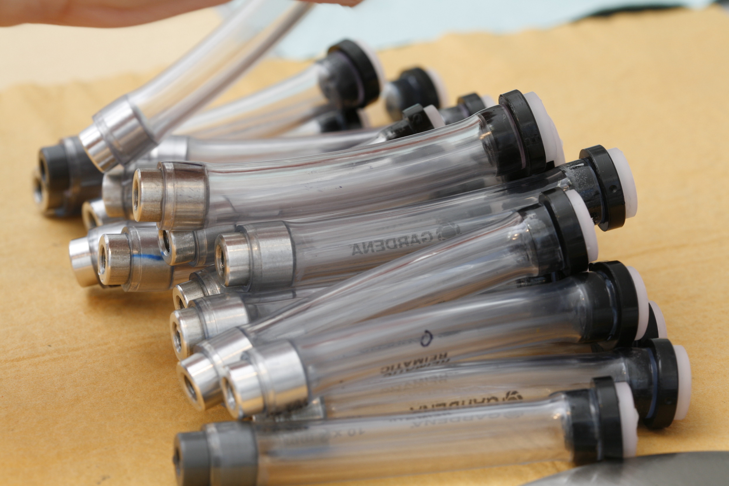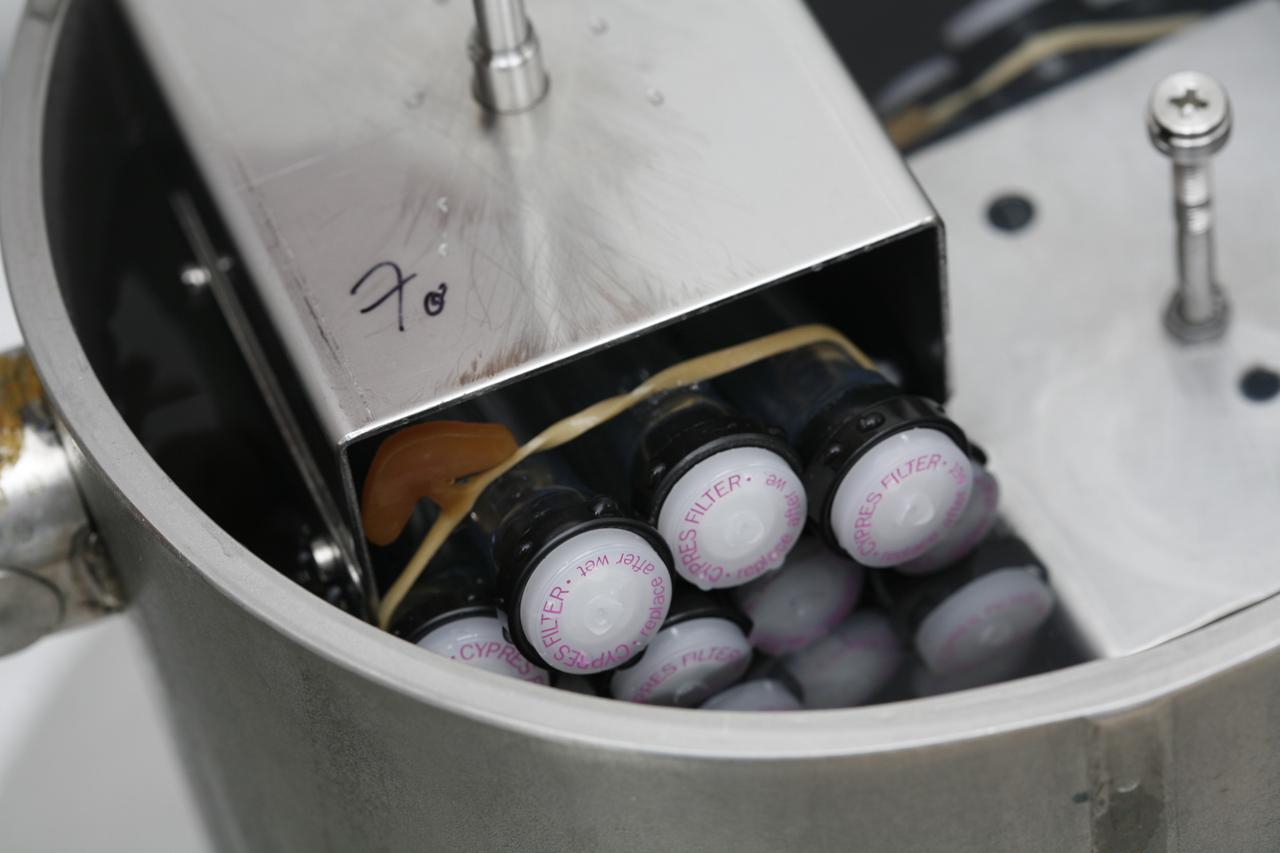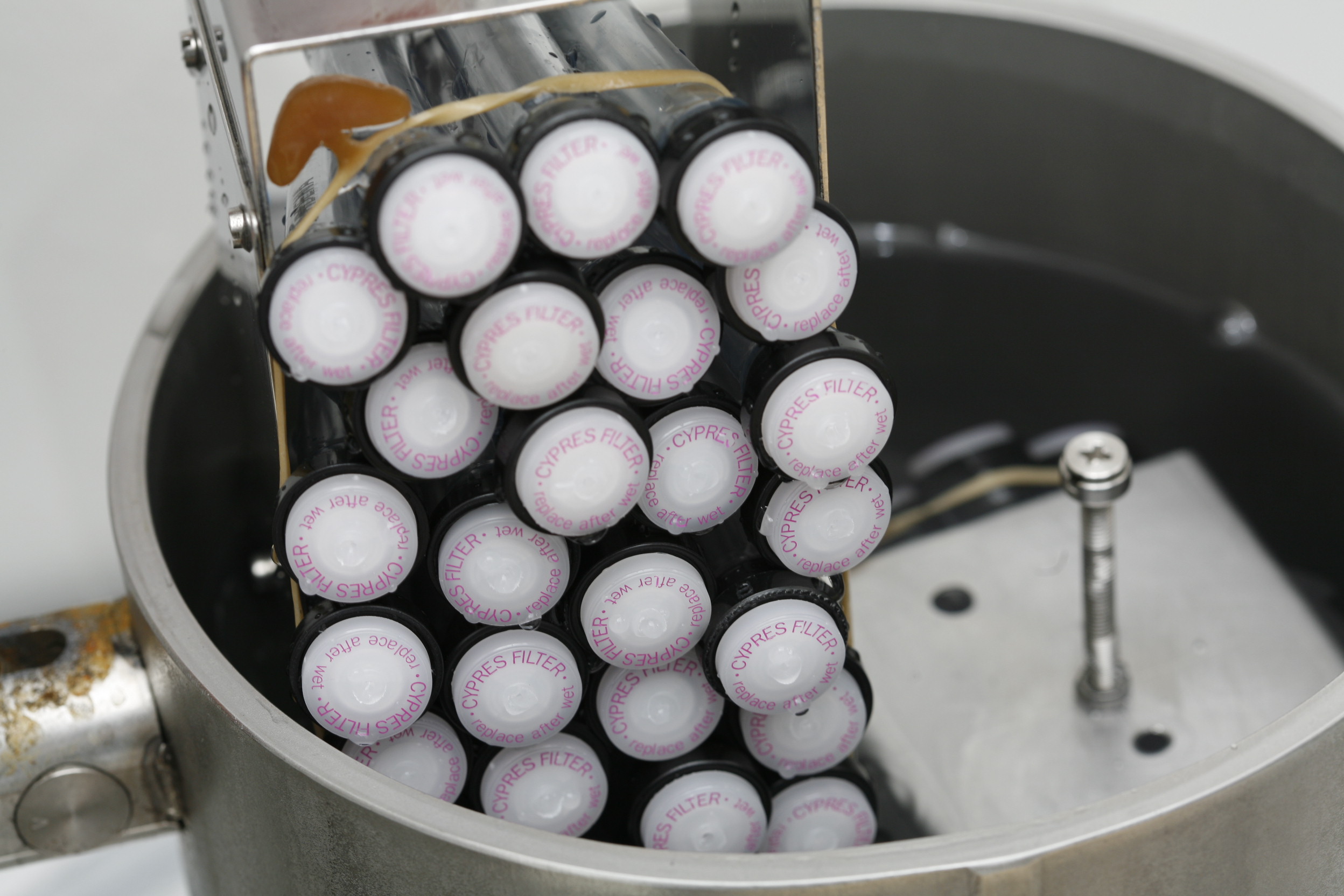 The filters are submerged entirely, still attached to the tubes.